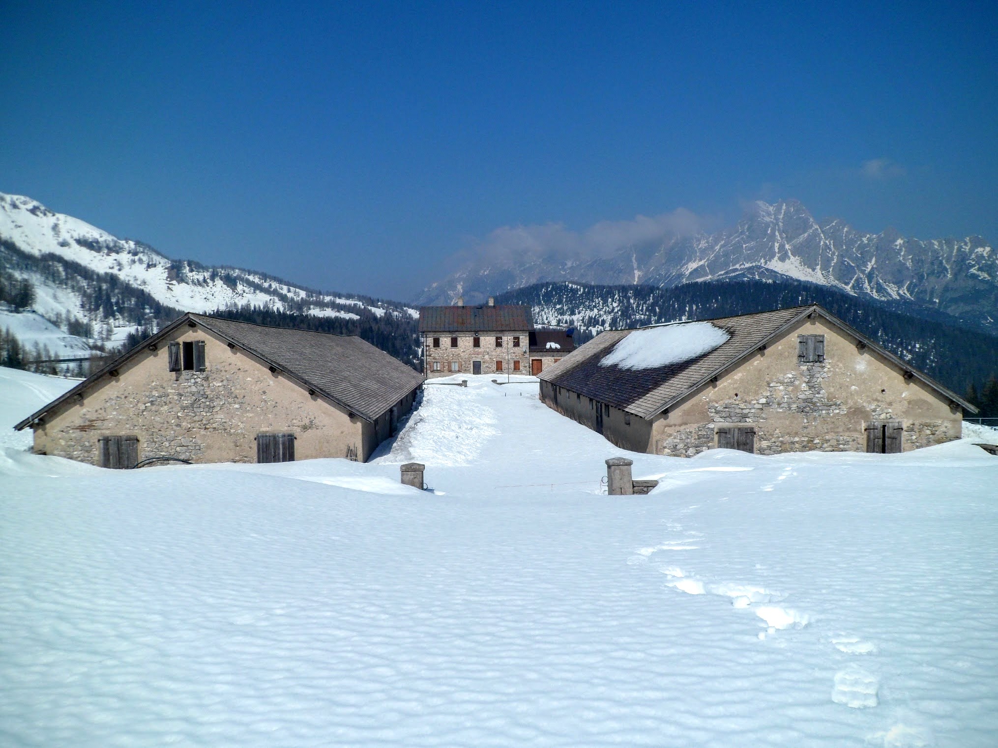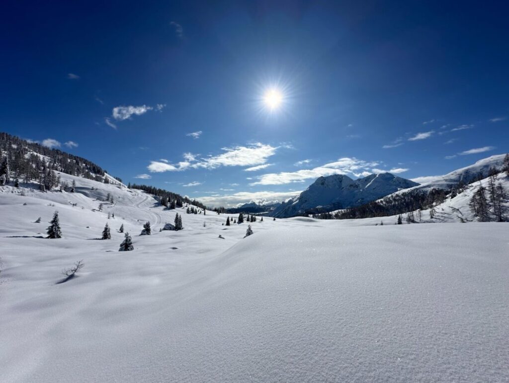 Quando si raggiunge l’altopiano, lo sguardo si perde in un mare bianco che sembra non avere confini. Le Dolomiti Pesarine appaiono come sagome scolpite contro il cielo, e il vento porta con sé una sensazione di spazio infinito. La pedalata diventa più morbida e regolare, mentre la traccia nella neve conduce verso Casera Razzo, adagiata sul pendio come un rifugio fuori dal tempo.