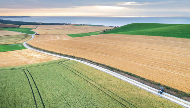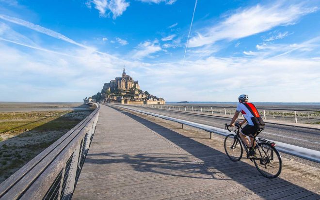 L’avventura inizia nel porto di Roscoff, in Bretagna, un punto di snodo anche per Eurovelo 1. Roscoff è accessibile via treno e l’aeroporto più vicino è quello di Brest. La Bretagna, con la sua storia indipendente e la lingua bretone, unica lingua celtica ancora parlata nell’Europa continentale, offre un inizio suggestivo. Si pedala vicino alla costa, attraversando borghi come Saint-Malo, con la sua imponente fortezza e la tomba del poeta Chateaubriand.