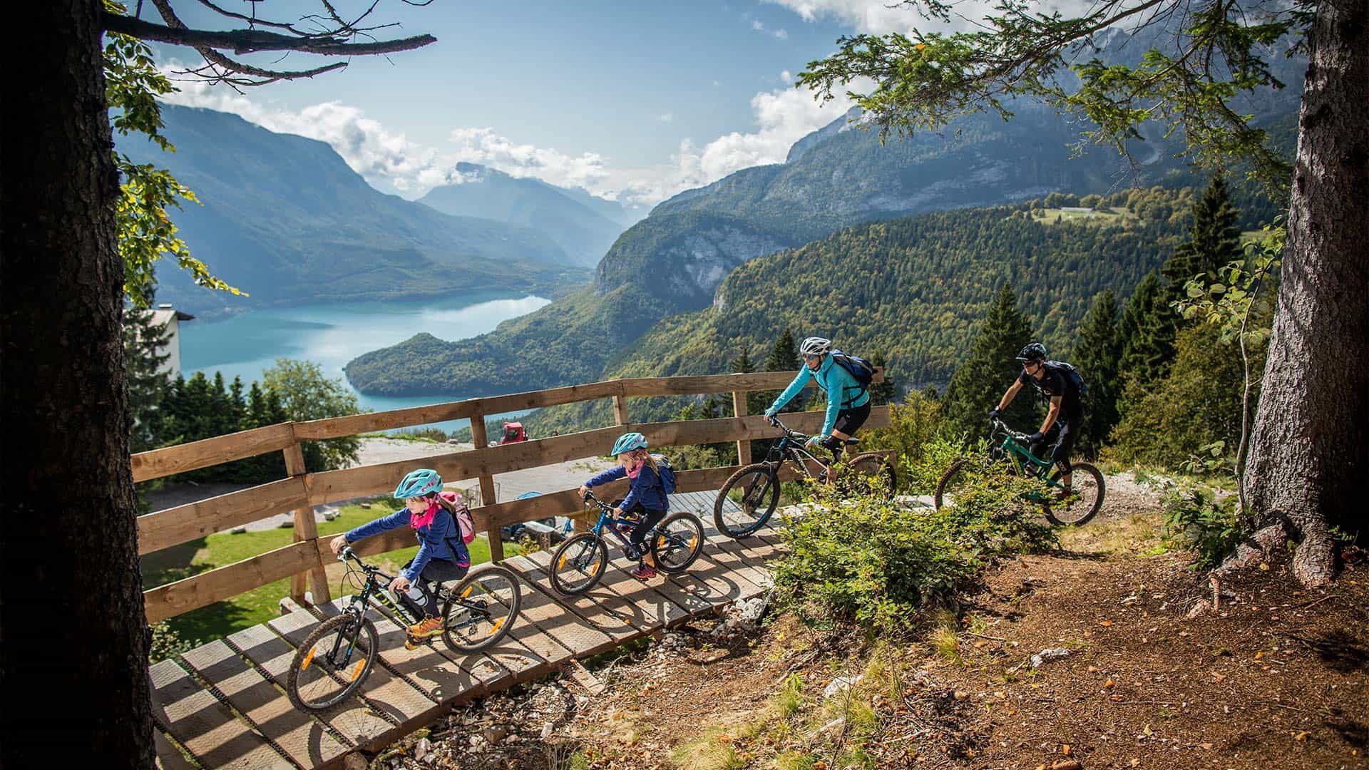 Il primo tratto del percorso ciclabile costeggia il lago, su una pista ben segnalata e pianeggiante. È il riscaldamento perfetto: il rumore delle ruote sull’asfalto si mescola al canto degli uccelli e al profumo dei pini. Dopo pochi chilometri, il sentiero si inerpica dolcemente verso Andalo, attraversando pascoli e piccoli ponti in legno. Qui, il paesaggio cambia: il verde brillante lascia spazio a viste panoramiche mozzafiato, con scorci sulle valli sottostanti.