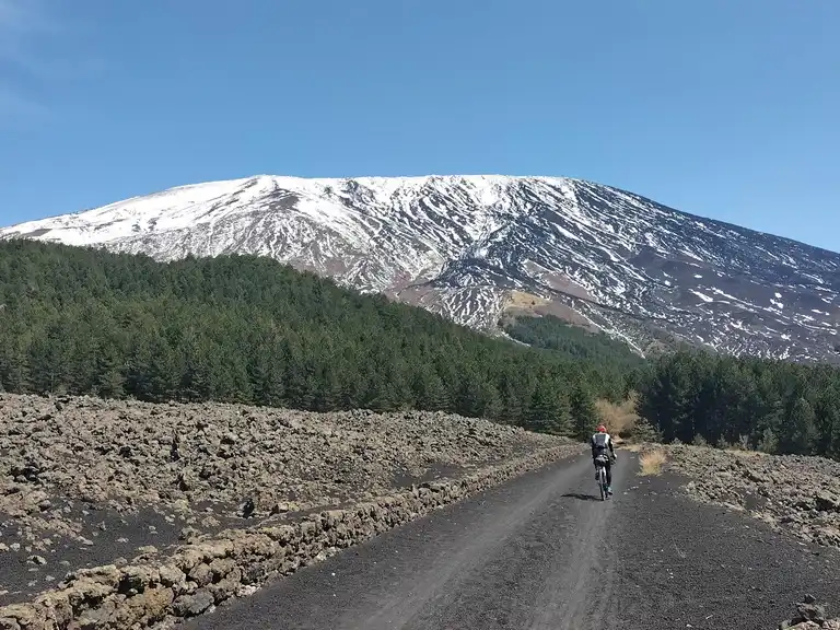 L’Etna, con i suoi oltre 3.300 metri di altitudine, è il vulcano attivo più alto d’Europa e uno dei più affascinanti al mondo. Situato nella Sicilia orientale, domina il paesaggio con la sua imponenza e la sua attività costante, che ha modellato nei secoli un territorio unico per biodiversità, geologia e cultura. Nel cuore di questo paesaggio vulcanico si snoda la Pista Altomontana dell’Etna, uno dei tratti più spettacolari del Sentiero Italia CAI. Lunga circa 36 km, collega il versante nord e sud del vulcano, da Rifugio Ragabo a Serra la Nave, offrendo un’esperienza cicloturistica immersiva e avventurosa. Il Parco dell’Etna, istituito nel 1987 e riconosciuto come patrimonio mondiale UNESCO nel 2013, protegge questo ecosistema straordinario, dove si alternano foreste secolari, colate laviche, crateri secondari e villaggi rurali.