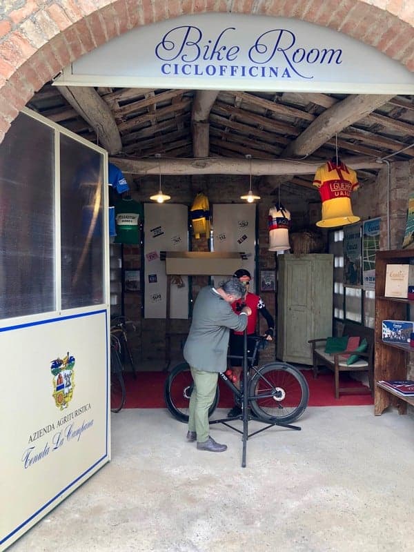 A La Campana, ci accoglie Federico, che la dirige con passione e competenza e ci fa subito sentire a casa. La lezione teorica di Cunego parte inevitabilmente da “quella tappa” in cui prese il volo, quei 220 chilometri che portarono i corridori da Carrara a Montalcino nella settima tappa di quel Giro d’Italia 2010. Damiano, racconta del fango che copriva gli occhiali e che per giorni ha continuato a uscirgli dagli occhi, e della fatica, a pedalare con tutto quel fango.