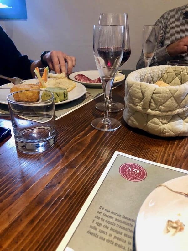 Poi, come da programma, ci aspetta uno “spuntino, per pedalare nutriti e leggeri”. Ma era un’imboscata. Me ne accorgo al terzo bicchiere di ottimo vino, al terzo piatto di crostini, frittini, assaggini di squisitezze tutte realizzate con ingredienti della tenuta.
