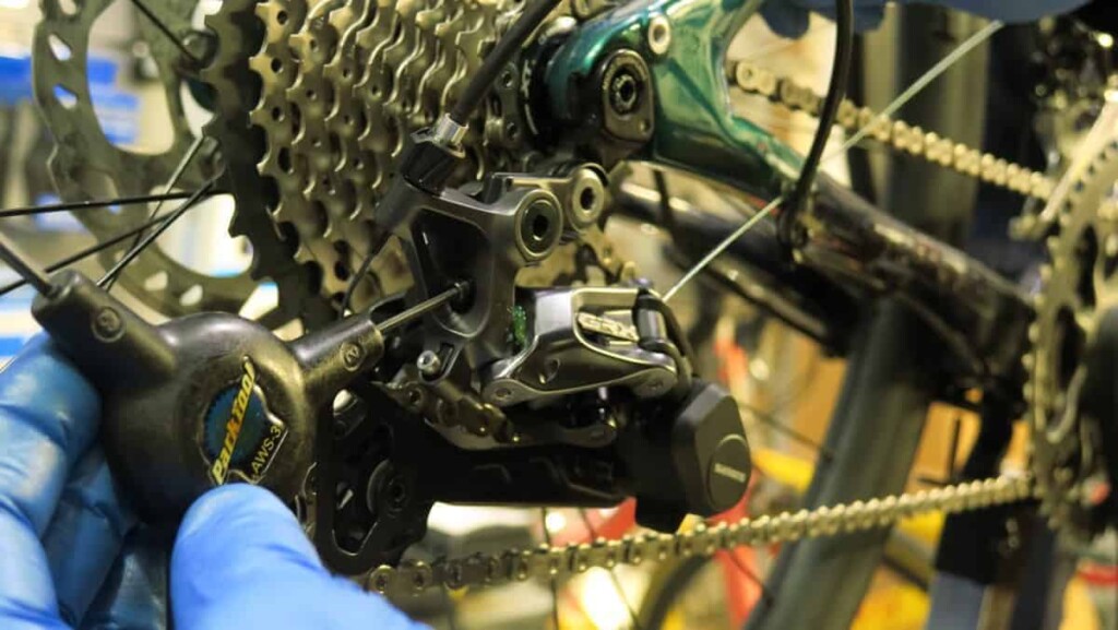 Il difetto di registrazione che origina il salto di catena non riguarda la tensione dei cavi dei deragliatori, ma la regolazione dei registri di fine corsa dei due componenti (o solo del cambio posteriore nel caso in cui si abbia una bici con corona singola), ovvero quelle viti che definiscono la precisa capacità di lavoro dei deragliatori sulla “scala” dei pignoni e sulle corone anteriori.