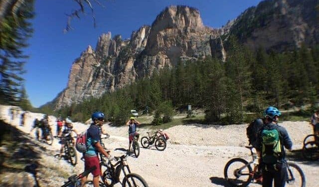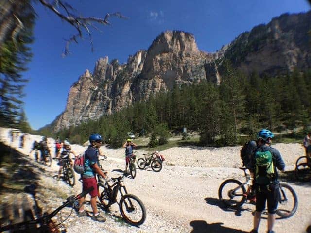La partenza del quarto e ultimo giorno della Shimano e-mountain bike experience avviene in un clima di euforia per la giornata che si prospetta, ieri giornata bellissima, ma oggi il percorso attraversa alcuni dei posti più belli delle dolomiti. Al contempo un misto di stanchezza e di delusione per l’imminente fine del tour inizia ad affiorare. Ma una volta ritirate le nostre bici, tutto prende un aspetto diverso e quello che conta è divertirsi!! Oggi pedalerò con una Centurion da 27,5.