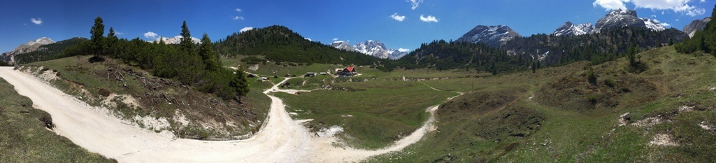 Dopo le coccole culinarie, ci aspetta un pomeriggio di coccole visive. I panorami che ci attendono fanno salire l’adrenalina e inducono tutti a velocizzare la pausa per avere più tempo da pedalare. Riprese le ebike, superiamo il lago del pianoro e lungo una strada sterrata piena di tornanti e pietre, con una discesa fatta tutta d’un fiato, “rotoliamo” nella valle Salata. La Croda Rossa, ci sovrasta, bellissima! La valle con i suoi prati, i boschi,e il torrente che l’attraversa sembra uscita da un dipinto. Dal fondo valle seguendo una strada militare, ormai diventata un sentiero, saliamo all’alpeggio di Lerosa, da dove è possibile ammirare ancora meglio la Croda Rossa e le cime che la circondano.