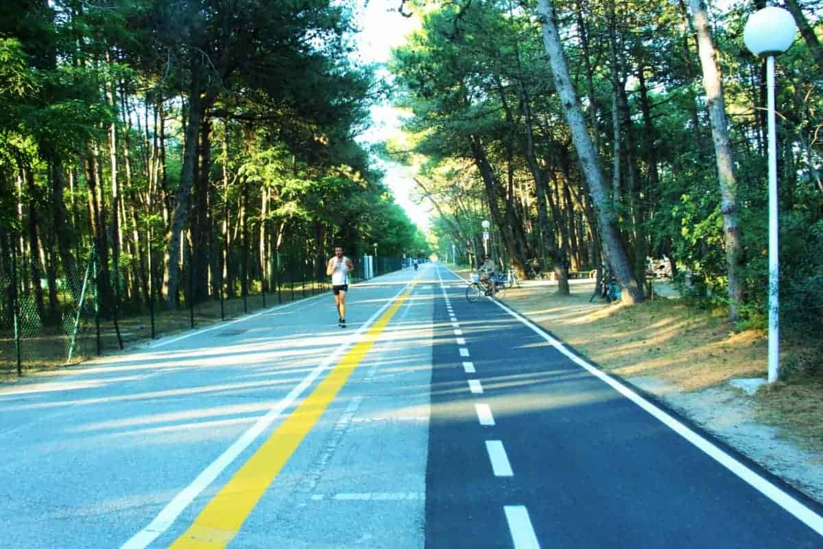 Da Riviera si prende poi il viale Adriatico e si raggiunge il lungomare. Tra oleandri, sempreverdi e pittosfori si raggiunge Lignano Pineta. Costeggiando le rotonde, tanti fortini di turisti ognuno con la propria bandiera, si arriva alla cittadina dalla forma a chiocciola, ideata dall’architetto udinese Marcello D’Olivo. “Archi” e “raggi” si incrociano in un gioco urbanistico ipnotico e circolare, impossibile da vedere a occhio nudo, se non con una mappa. Anche Lignano Pineta ha il suo verde tributo al premio Nobel americano: tra il corso degli Alisei e via Tarvisio c’è il parco Hemingway, tempio degli sportivi – ottimo anche per ciclisti – con il suo percorso vita.
