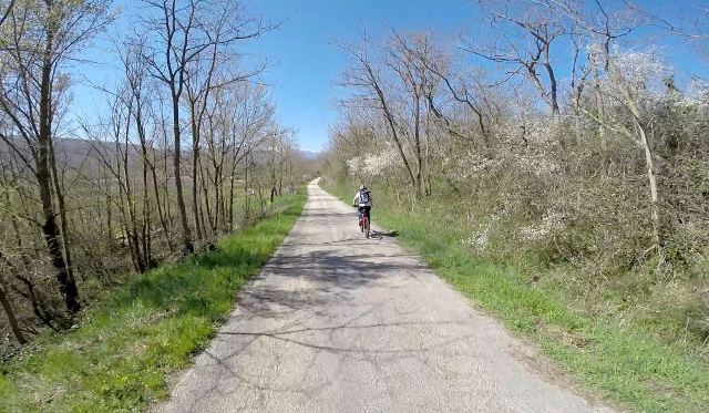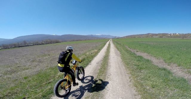 E’ un giro ad anello, facile, alla portata di tutti, i chilometri alla fine saranno circa 20. La partenza è dalla stazione di San Giuliano del Sannio. Il primo tratto è sulla strada asfaltata, che per il traffico assolutamente assente potrebbe essere scambiata per una ciclabile. Abbandonato l’asfalto, ci immergiamo nelle strade bianche che dividono i campi e che offrono il panorama sui paesini arroccati e sulle cime ancora imbiancate del Matese. Qui la densità abitativa è talmente bassa che in una mattinata incontreremo una sola persona, che come noi è in bicicletta.