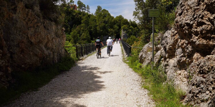 Il primo tratto del nostro percorso è disegnato tra strette gole e ci fa godere dei paesaggi straordinari pedalando su lievi pendenze, fino a raggiungere la quota massima nella galleria della Caprareccia.