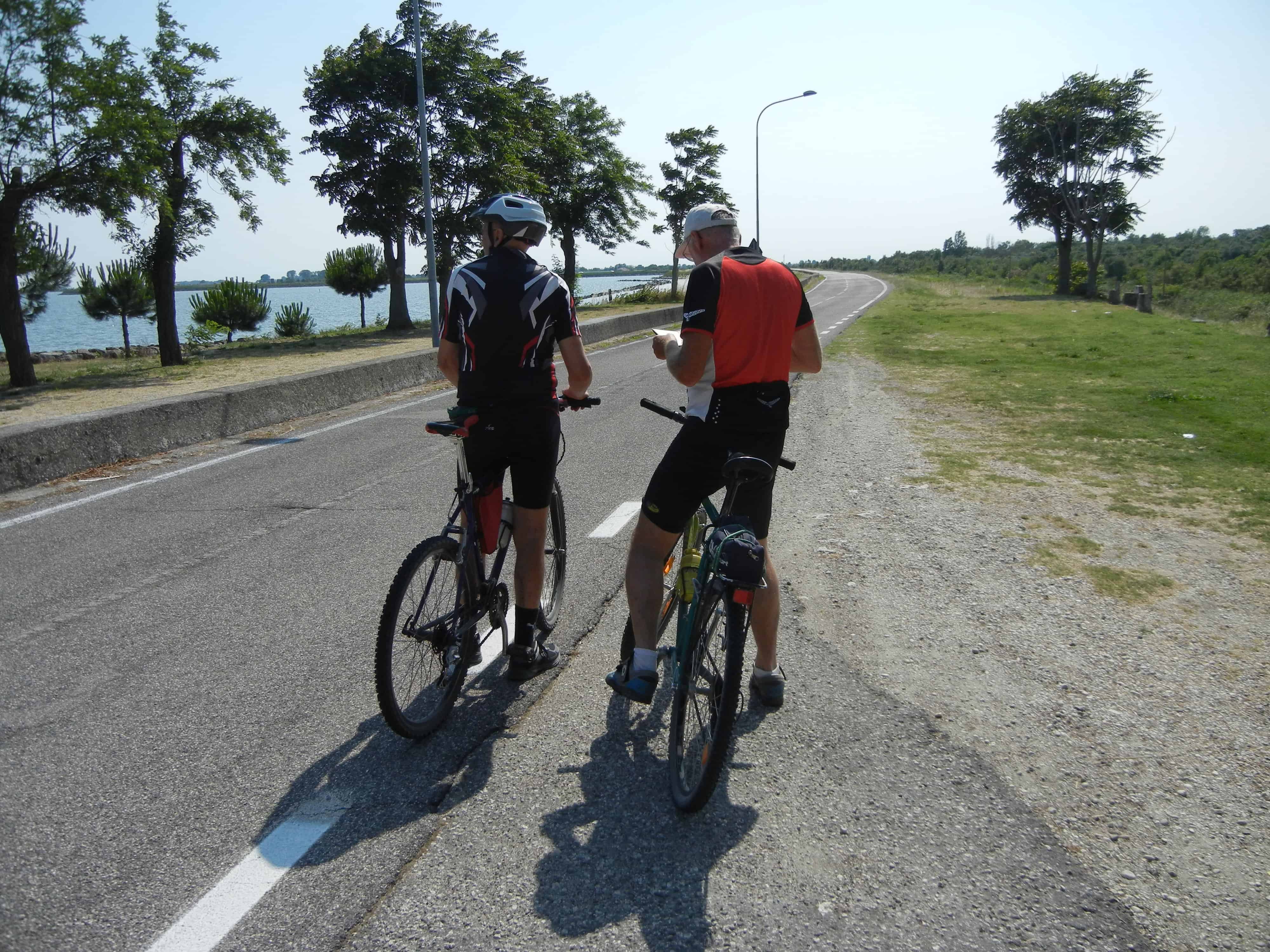 Una volta tornati alle biciclette, possiamo fare un giro per il paesino di Pila, e proseguendo costeggiamo la laguna di Barbamarco, dove troviamo il porto peschereccio e il mercato del pesce all’ingrosso. Ritornati sull’argine principale del Po di Venezia, lo seguiamo e possiamo renderci conto come tra il livello del fiume e quello delle terre ci sia una differenza di cerca due o tre metri a sfavore delle terre.