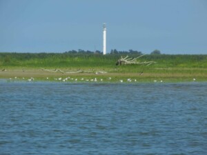 In questa zona vedrete le conseguenze della subsidenza, cioè l’abbassamento del suolo a causa dell’estrazione negli anni dal 1930 al 1961 del metano. Qui il mare, piano piano si sta riprendendo quella zona costiera che era stata bonificata, creando lagune salmastre con costruzioni fantasma, che venivano utilizzate come depositi di materiale e che ora sono allagate.