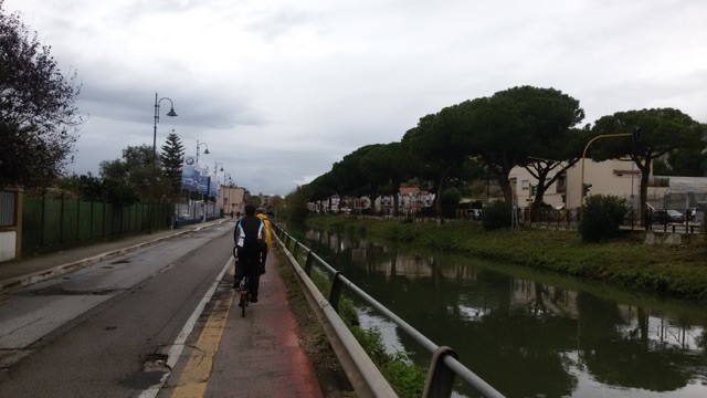 Le strade a scacchiera che corrono lungo i canali di bonifica dell’Agro Pontino presentano un traffico pressoché inesistente, al ritmo di un’auto ogni mezz’ora, e sono pertanto una sorta di rete ciclabile non riconosciuta ma di fatto fruibile anche da famiglie con bambini.