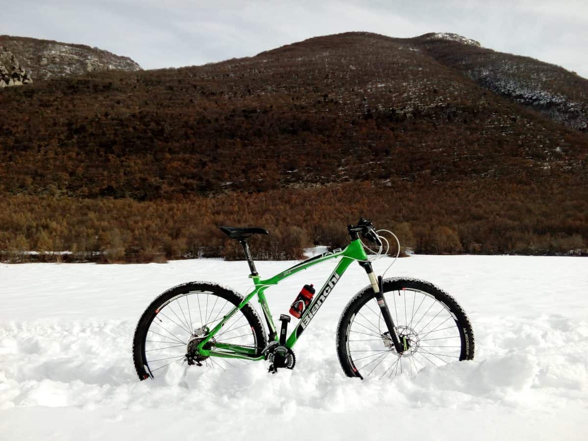 Da qui percorriamo qualche centinaio di metri di provinciale asfaltata per imboccare una stradina secondaria in leggera salita: passiamo sotto l’autostrada, e da qui la strada diventa progressivamente più bella, circondandosi di alture appenniniche innevate. Un paio di tornanti, e la strada si fa boscosa: una manciata di chilometri e arriviamo ai rifugi di Cartore, da dove parte l’itinerario MTB per il Lago della Duchessa: ci troviamo a 950 m s.l.m., e di gennaio c’è troppa neve per proseguire ai duemila e rotti del lago, che affronteremo in primavera. Ai rifugi, ricavati da un paese abbandonato recuperato dalla comunità montana dei Monti della Duchessa, si può invece mangiare e dormire su prenotazione.