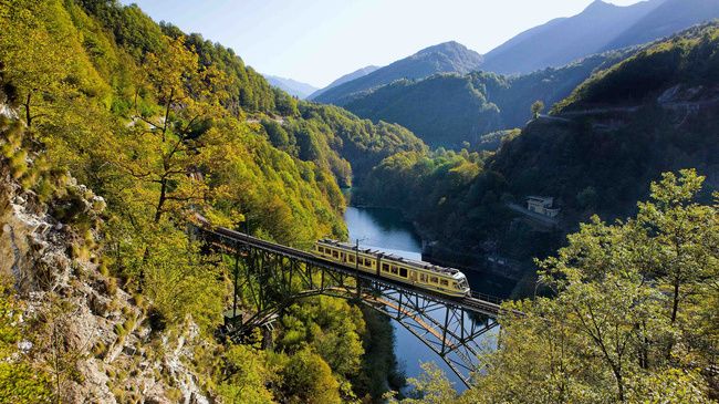 Il tratto svizzero della ferrovia attraversa il suggestivo territorio di “Centovalli” tra boschi di faggio, corsi d’acqua e montagne dai fianchi frastagliati, superando con ponti spettacolari le cascate del torrente Melezzo.
