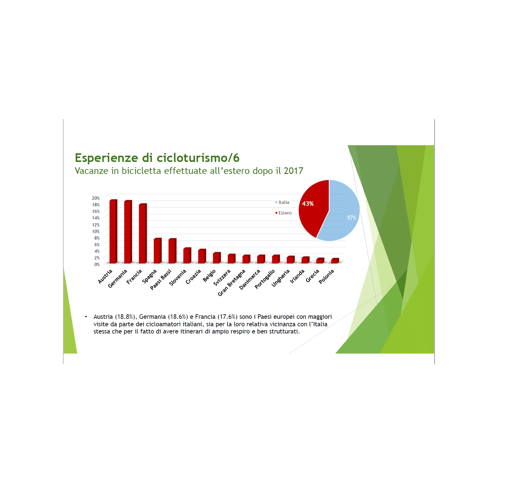 Il 43% delle esperienze di viaggio in bicicletta raccontate dagli intervistati si sono svolte all’estero: Austria, Germania e Francia sono i paesi europei con il maggior numero di visite, sia per la vicinanza con l’Italia, sia per la presenza di percorsi cicloturistici conosciuti e ben organizzati, che offrono anche tappe culturali nelle città attraversate. La predilezione per chi pedala invece nel Bel Paese (il 57%) è per le regioni del Nord-Est (38%, trainate da Veneto e Trentino Alto Adige), seguite dal Nord-Ovest (27%) e dal Centro (20%), in particolare la Toscana.