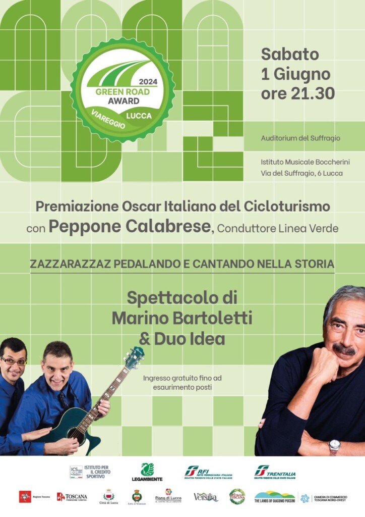 Nella serata di sabato 1° giugno, grande festa a partire dalle 21,00 al Teatro Boccherini, con ingresso libero alla cittadinanza. Peppone Calabrese presenterà con la consueta verve la cerimonia di premiazione delle ciclovie vincitrici dell’Oscar del Cicloturismo 2024, mentre Marino Bartoletti sarà la star della serata con il suggestivo spettacolo teatrale “ZazzarazzaZ, pedalando e cantando nella storia”, dove figura nelle vesti di autore, attore, narratore, assieme al Duo Idea per l’accompagnamento musicale e non solo.