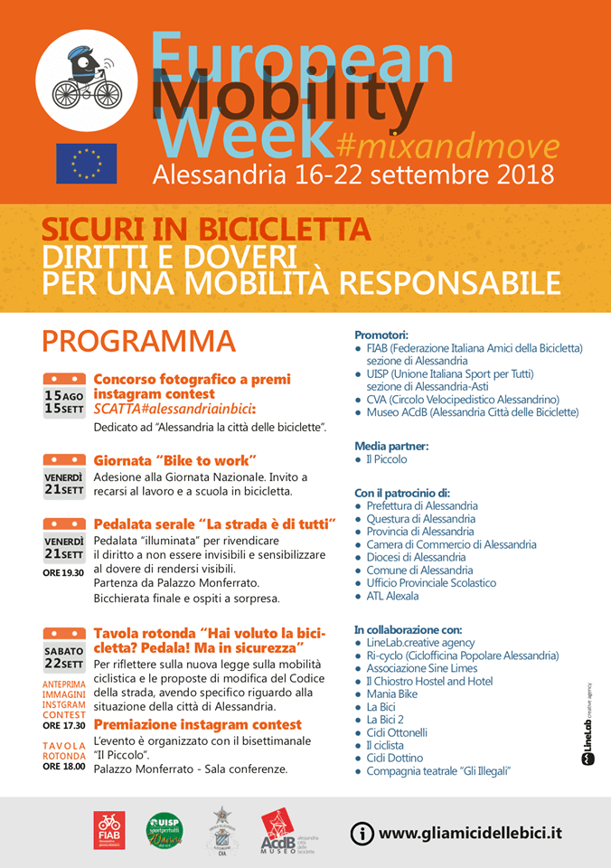 In occasione della Settimana Europea della Mobilità (SEM) dal 16 al 22 settembre, la Città delle Biciclette, Alessandria, con le sezioni alessandrine di FIAB e UISP, con il Circolo Velocipedistico Alessandrino e il Museo ACdB, organizza una serie di appuntamenti e di eventi per richiamare l’attenzione dei cittadini e delle istituzioni sulle problematiche e le opportunità connesse all’uso delle due ruote sulle strade urbane. La manifestazione si intitola “Sicuri in bicicletta. Diritti e doveri per una mobilità responsabile”.
