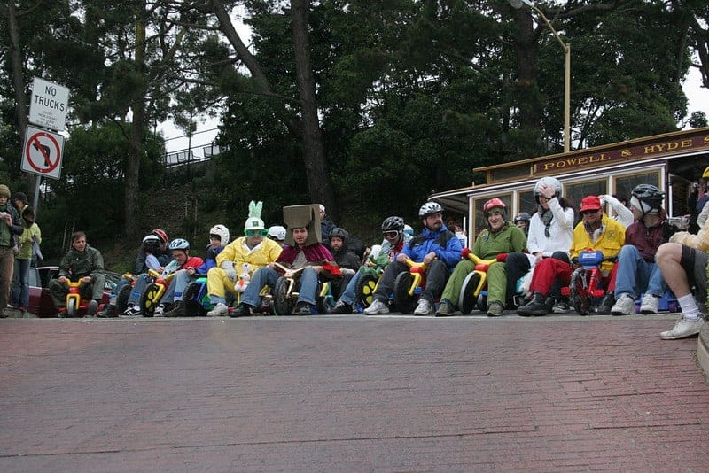 Il posto dove più di tutti si ci dà alla follia in bicicletta è l’America. Evento ormai storico è il Bring you own big wheel – BYOBW (https://bringyourownbigwheel.com/) che dal 2000, la domenica di Pasqua a San Francisco, vede scendere per le colline di Lombard Street folle di appassionati in triciclo da bambino. Per chi volesse partecipare una raccomandazione: Safety first! Il che non toglie il divertimento.