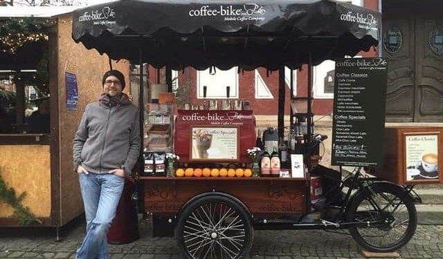 Jan Sander e Tobias Zimmer hanno avuto l’idea nel 2010, durante un viaggio in Danimarca. Appena usciti dall’università si sono messi all’opera e sono riusciti a creare un franchising di bike café non solo in terra teutonica, ma anche in molte città europee. Al momento sono circa 50 le Coffee-bike attive in Germania, Austria, Svizzera, Olanda, Francia, Repubblica Ceca. E sono arrivate pure in Kuwait e a Dubai. Per produrre una bicicletta-bar ci vogliono dalle quattro alle sei settimane. Oltre al caffè offrono spremute d’arancia, bagel, panini e prodotti di pasticceria. http://test.coffee-bike.com/en