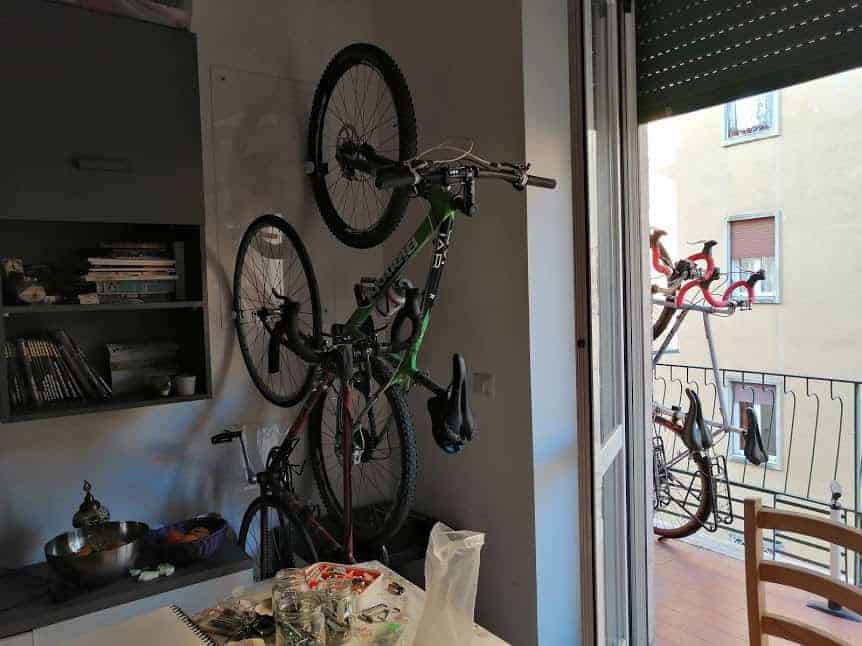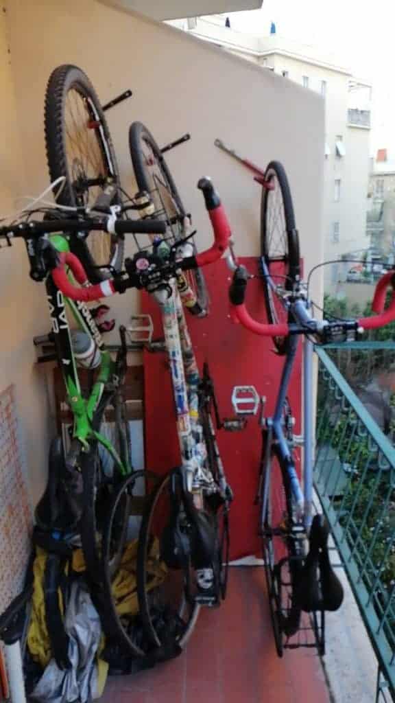 Dove sistemo le mie bici quando non le uso? Per chi ha un garage questo problema probabilmente non si pone (occhio ai furti, un rischio sempre in agguato specie per chi ha bici di valore e le tiene in posti cui non accede spesso). Ma per chi ha spazi limitati e non vuole creare disordine in casa occorre ingegnarsi, le soluzioni non mancano. Personalmente, con 4 bici e una casa non certo enorme, per anni sono stato costretto a ripiegare sulla soluzione-balcone: alcuni ganci da ferramenta del tipo simile a quelli che si trovano sui vagoni ferroviari adibiti al trasporto bici, una vecchia tenda da campeggio come copertura dall’umidità ed ecco ricavata una rastrelliera casareccia.