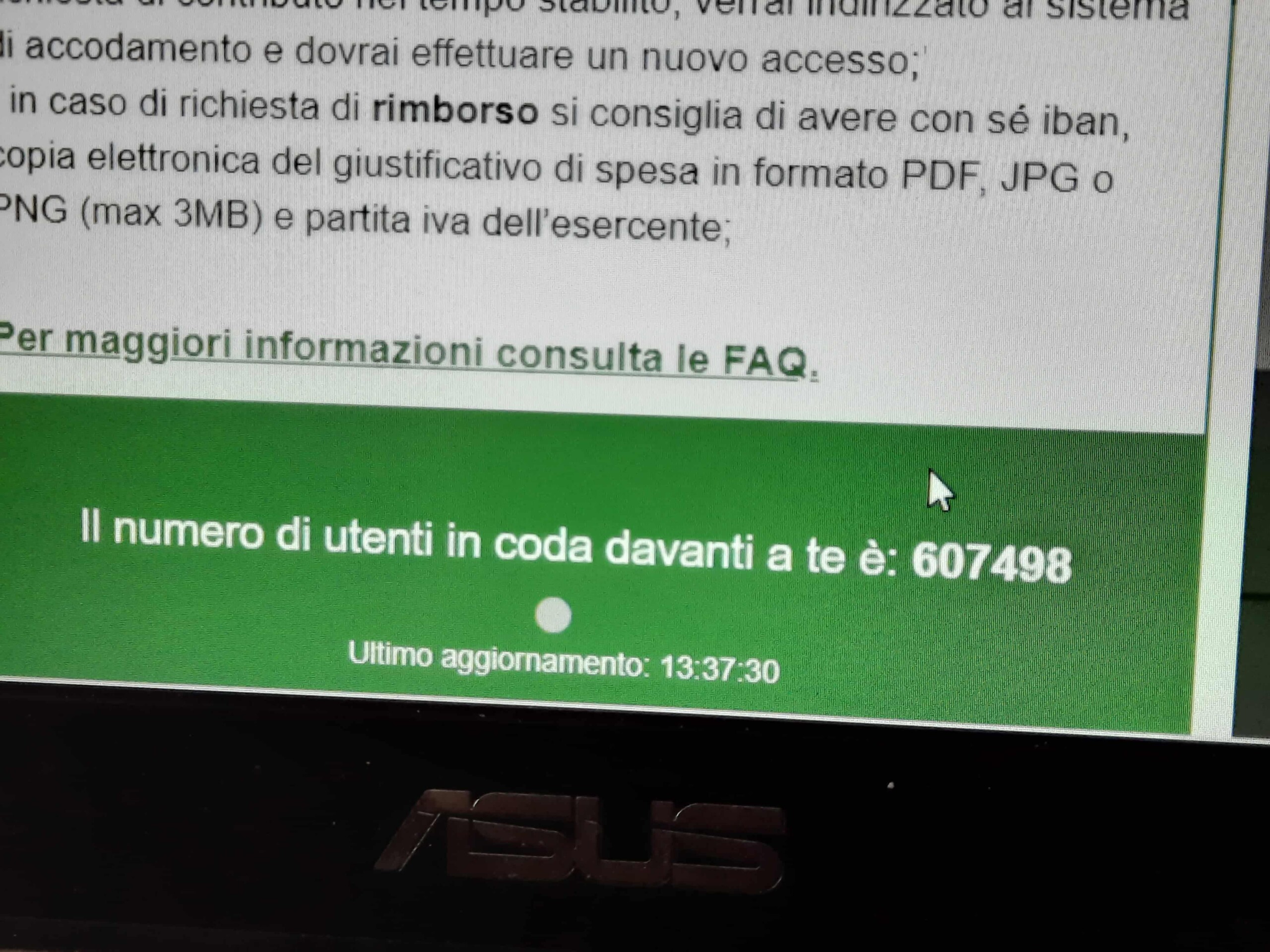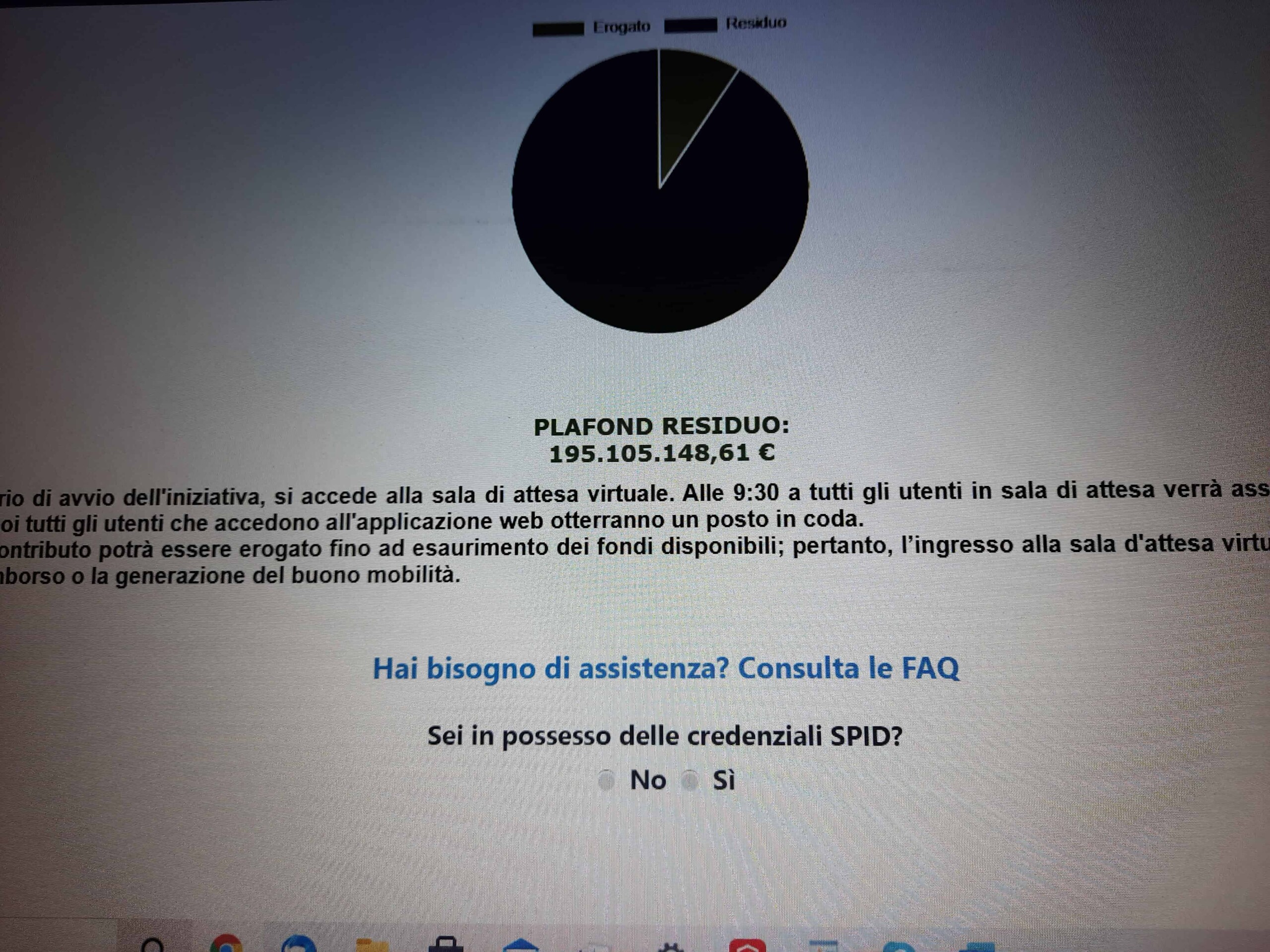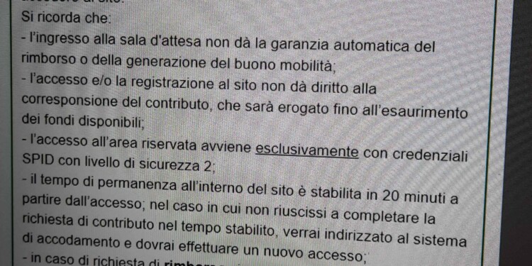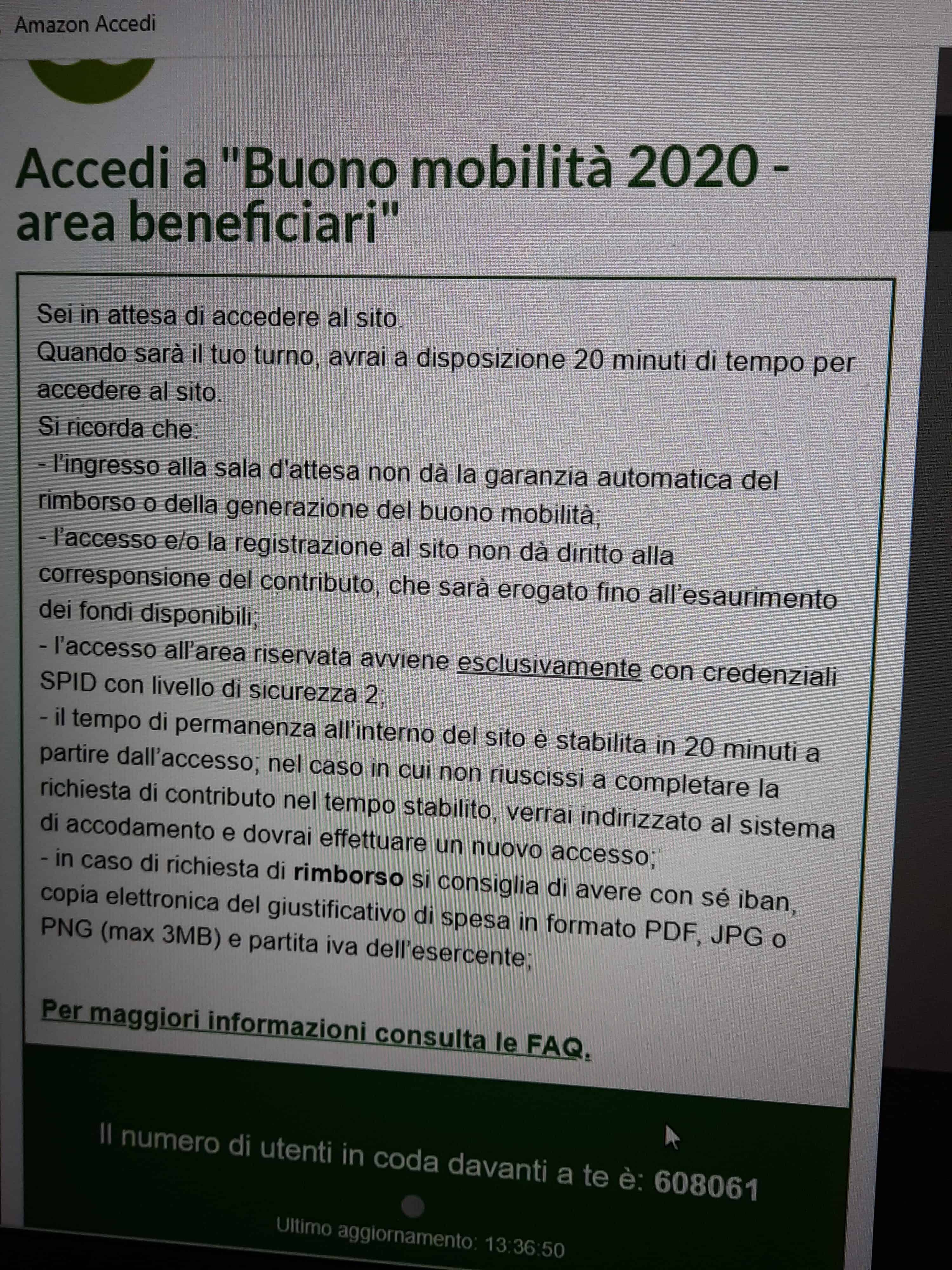 Poco dopo le 9,00, il portale per la richiesta di rimborso è andato online per la prima volta, ma accedere era praticamente impossibile. Il Ministero aveva annunciato di avere attivato per il 3 novembre, un team pronto a intervenire per risolvere blocchi del sistema. Anche alle 10,00 il sito era irraggiungibile, i pochi che sono riusciti ad accedervi poco dopo, come ci dicono alcuni dei nostri lettori, si sono visti comparire un messaggio che li avvisava di migliaia di persone davanti a loro in coda. Nel frattempo il plafond erogabile era 215.000.0000 euro. Poco sotto l’avviso: “Alle ore 9:00, orario di avvio dell’iniziativa, si accede alla sala di attesa virtuale. Alle 9:30 a tutti gli utenti in sala di attesa verrà assegnato un posto in coda. Dalle ore 9:30 in poi tutti gli utenti che accedono all’applicazione web otterranno un posto in coda. Si ricorda che il contributo potrà essere erogato fino ad esaurimento dei fondi disponibili; pertanto, l’ingresso alla sala d’attesa virtuale e il posto in coda non garantiscono il rimborso o la generazione del buono mobilità».