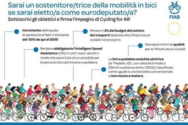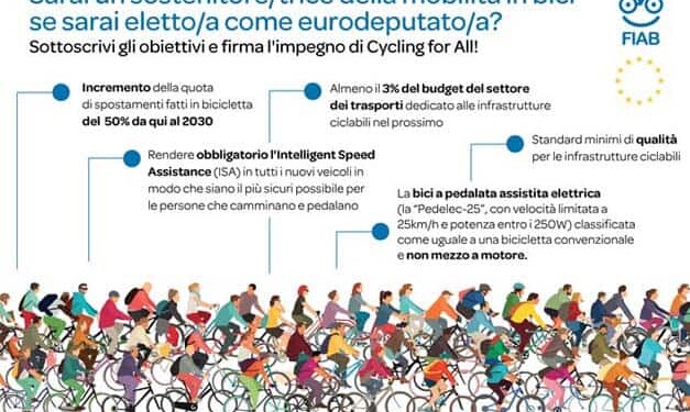 Attivare delle politiche incisive per portare gli spostamenti in bicicletta ad una crescita del 50% entro il 2030, questo chiede la FIAB-Federazione Italiana Ambiente e Bicicletta e ECF-European Cyclists’ Federation a tutti i candidati al Parlamento Europeo, attraverso la campagna “Cycling for All”, invitandoli, in caso di elezione (si vota domenica 26 maggio), ad essere sostenitori della mobilità in bici. “Cycling for All” chiede a tutti i candidati a diventare “ambasciatori della ciclabilità” e a sottoscrivere un impegno sulle tematiche bike friendly che dovranno essere centrali nella nuova legislatura 2019-2024, in accordo con la Strategia Ciclistica Europea (EUCS), e sintetizzate in cinque obiettivi chiave: incremento della quota di spostamenti fatti in bicicletta del 50% da qui al 2030; rendere obbligatorio l’Intelligent Speed Assistance (ISA) in tutti i nuovi veicoli in modo che siano il più sicuri possibile per le persone che camminano e pedalano; almeno il 3% del budget del settore dei trasporti dedicato alle infrastrutture ciclabili nel prossimo bilancio pluriennale (2021-2027); standard minimi di qualità per le infrastrutture ciclabili; la bici a pedalata assistita elettrica (la “Pedelec-25”, con velocità limitata a 25km/h e potenza entro i 250W) classificata come uguale a una bicicletta convenzionale e non mezzo a motore.