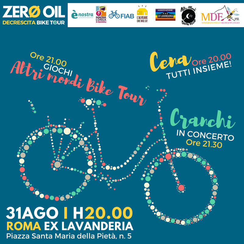 Tutti possono partecipare, anche per una sola tratta. Si tratta della terza edizione di questa iniziativa promossa dal Movimento per la Decrescita Felice e Altri Mondi Bike Tour. Partenza quindi il 31 agosto da Roma con ritrovo alle 16,30 in Galleria Borghese. Nella giornata di apertura del Bike Tour verrà organizzata anche una serata all’Ex Lavanderia, al Padiglione 31 del Parco Santa Maria della Pietà (piazza Santa Maria della Pietà n. 5): l’evento inizierà alle 20,00 con la cena, dalle 21,00 giochi e spettacolo organizzato da Altri Mondi Bike Tour e a seguire il concerto di Cranchi, cantautore e folk band composta da Massimiliano Cranchi (chitarra e voce) e Marco Degli Esposti (chitarra e voce).