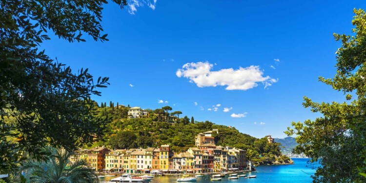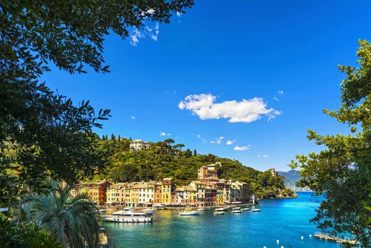 Portofino luxury landmark aerial panoramic view. Village and yacht in little bay harbor. Liguria, Italy