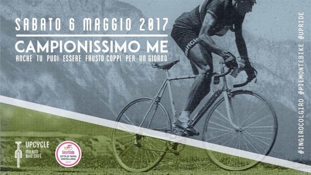 In occasione della centesima edizione del Giro d’Italia, Upcycle Milano Bike Cafè, rende omaggio alle Terre di Fausto Coppi che quest’anno vedranno il passaggio della corsa rosa per ben due volte: il 19 maggio con arrivo di tappa a Tortona e il 20 maggio con partenza da Castellania e lo fa organizzando una pedalata non competitiva di 100 km, per raggiungere Castellania (Al), città natale del Campionissimo.