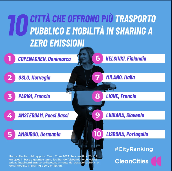 Parlando di città mi torna in mente il progetto Clean cities, coalizione europea di oltre 70 ONG, associazioni ambientaliste, movimenti di base e organizzazioni della società civile che ha come obiettivo una mobilità urbana a zero emissioni entro il 2030. Nell’edizione 2023 del City Ranking, sono state analizzate 42 città europee per vedere chi è più avanti in fatto di mobilità condivisa ed elettrica, argomento che sta a cuore a Clean cities che vorrebbe arrivare ad una mobilità urbana a zero emissioni. Come fare? Eliminando gradualmente le auto inquinanti e offrendo nelle città opzioni di mobilità a basso impatto climatico e competitive come le biciclette e monopattini in sharing, autobus a emissioni zero, car-sharing elettrico e infrastrutture di ricarica per EV.