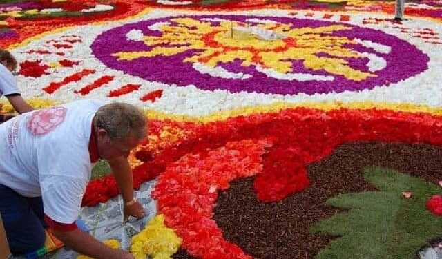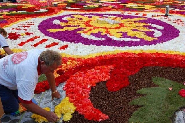 La realizzazione del tappeto di Fiori segue un piano di lavoro ben preciso che comprende numerose fasi e impegna centinaia di esperti giardinieri. Dopo il disegno del motivo, che normalmente viene concepito con largo anticipo, si effettuano i calcoli che consentono di individuare il numero di fiori necessari e se ne studiano le tonalità cromatiche. Terminata la progettazione, il lavoro vero e proprio comincia con il disegno sulla piazza delle linee che definiscono il motivo, continua con la posa del terreno e si conclude con la piantumazione dei fiori, uno a uno, in numero di circa 300 per metro quadro (in totale sono circa 750 mila!). Molti gli appassionati che accorrono ad assistere al lavoro della oliatissima macchina organizzativa: l’entusiasmo e la maestria dei giardinieri sono tali che la piantumazione avviene in circa (soltanto!) quattro ore.