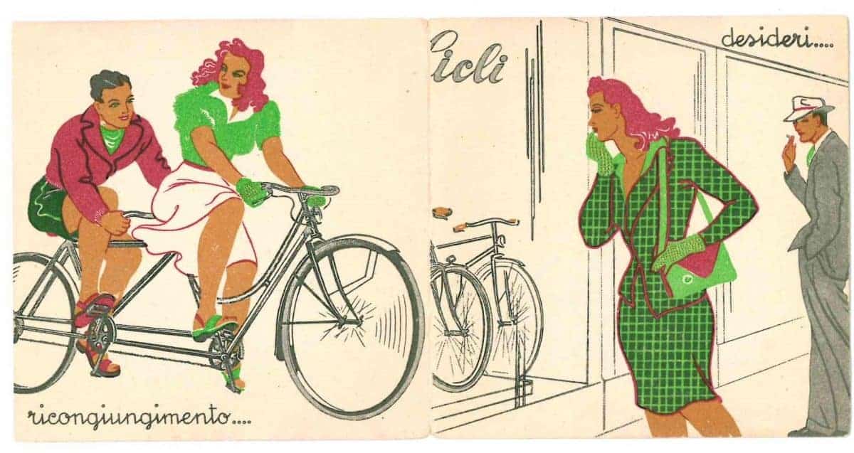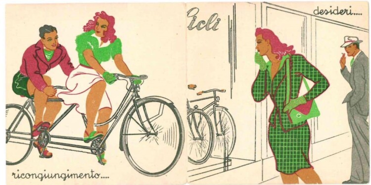 Agli esordi la bicicletta era definita “cavallo d’acciaio” e i ciclisti “cavalieri”. Le figurine documentano l’evoluzione dell’abbigliamento passato per gli uomini, da quello dei fantini ad abiti più pratici che lasciano scoperte gambe e braccia. È però il vestiario femminile a subire le trasformazioni maggiori: il nuovo mezzo di trasporto rende necessario l’abbandono delle gonne ottocentesche a favore di gonne-pantalone, galosce e stivaletti. La mostra prosegue con una serie di copertine di riviste, cartoline e bolli chiudilettera, di norma tratti da cartelloni pubblicitari e dedicati a particolari marche di bicicletta o a componenti come selle, fanalini e mozzi.