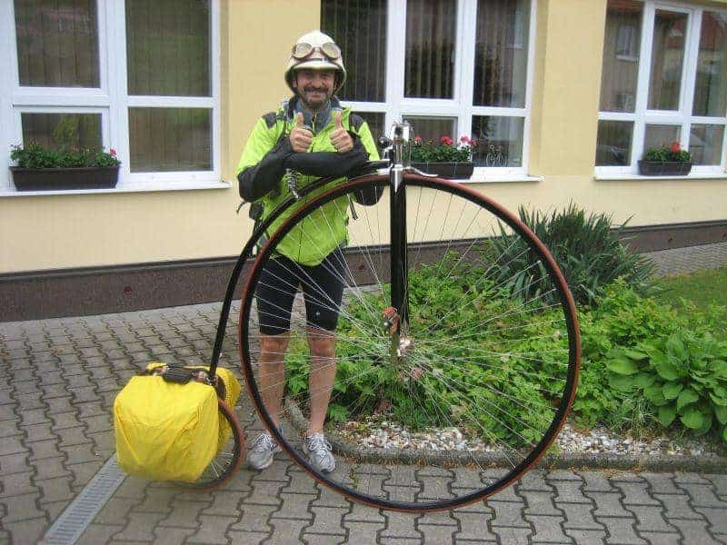 Nell’era della e bike c’è anche chi guarda al passato, Massimo Zaffari (foto altoadige.it) in sella ad un velocipede replica di una bici dell’800, ha percorso diversi tragitti lunghi ed impegnativi. In particolare, ha pedalato per i 48 tornanti deloo Stelvio con il 9% di pendenza sotto la pioggia. Il ricordo va agli anni ’50 quando nella penultima tappa del Giro d’Italia, il Passo dello Stelvio veniva affrontato per la prima volta. La vetta a 2.757 metri d’altezza, viene chiamata oggi “Cima Coppi” per ricordare quall’impresa su due ruote. Zaffari in una gara tutta sua indietro nel tempo, quella vetta l’ha raggiunta su un mezzo di 16 kg, con la ruota anteriore di 132 cm di diametro.