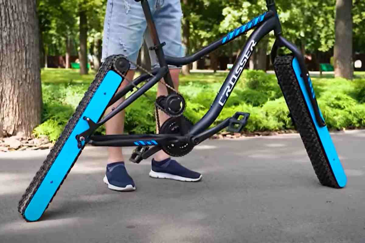 E allora iniziamo con il parlare della bici senza ruote, si avete capito bene senza ruote. Dopo i prototipi delle biciclette con le ruote quadrate o triangolari, arriva dal canale YouTube The Q, un ingegnere ucraino, che si è lanciato in una nuova sfida. Ha infatti realizzato una bicicletta senza ruote. Al posto di queste c’è un tubo di ferro rivestito di cingoli. Questi binari sono posizionati ad angolo sulla bicicletta, per mantenere il centro di gravità del ciclista, in modo che la bicicletta non cada. Si tratta dunque di una sorta di carro armato con le cinghie rotanti che spingono in avanti. E’ la prima bicicletta che si muove alla velocità di una camminata, ma con uno sforzo 10 volte maggiore.