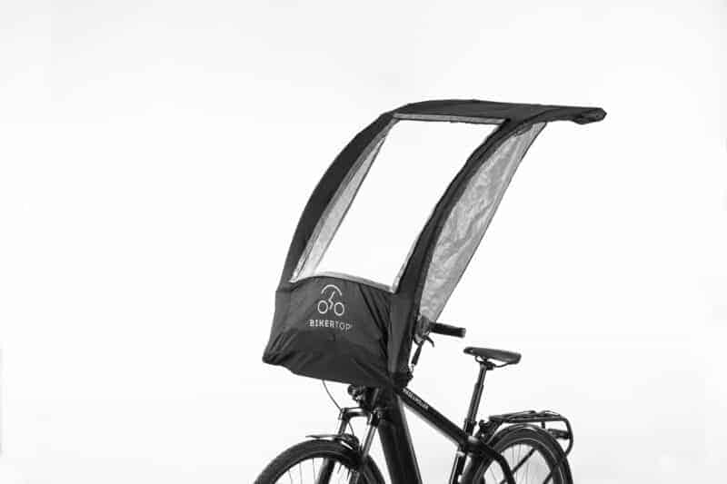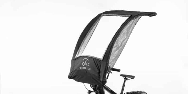 La BikerTop è composta da un telo contenuto in una borsa/bauletto (dal peso di 2,5 kg) posizionata sulla bicicletta, davanti al manubrio. Non è certo una novità assoluta per il mercato dove esistono già altri tipi di copertura, ma di solito sono strutture più pesanti e rigide. Questo invece, è un sistema che può essere aperto e richiuso in pochi secondi (il telo di copertura resta in tensione come un tettuccio). Proprio come si fa quando camminando inizia a piovere e si tira fuori l’ombrello, per poi richiuderlo appena smette. Il tessuto della copertura, simile a quello delle tende da campeggio, è trasparente nella prima sezione per garantire la visuale, per ora l’apertura di Bike Top è manuale, ma si sta valutando una soluzione automatizzata per il futuro.