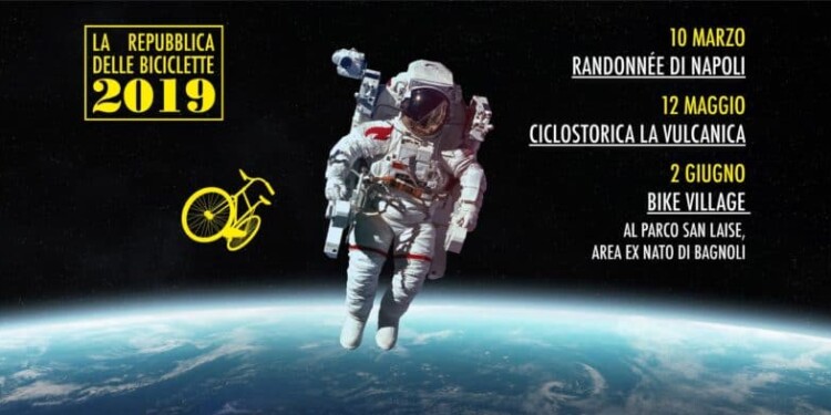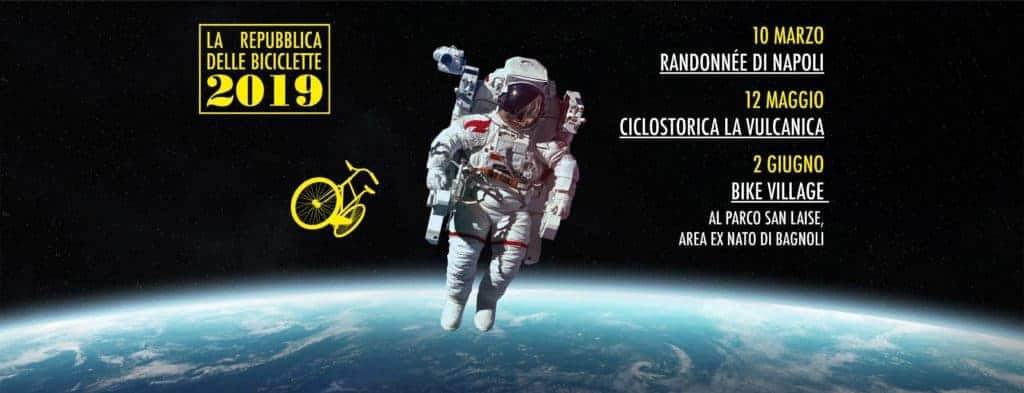 Il giorno della Festa della Repubblica (il 2 giugno) sarà anche quello del Napoli Bike Festival che quest’anno giunge all’VIII edizione. Si tratta di un appuntamento di rilevanza nazionale dedicato alla promozione della cultura della bicicletta e della mobilità sostenibile. Sarà insomma la festa della Repubblica delle biciclette sotto l’egida del claim “Con la tua bici puoi andare ovunque vuoi”, scelto in occasione del cinquantesimo anniversario del primo uomo sulla Luna e ripreso nello spot del Napoli Bike Festival con un astronauta in bici che appare in luoghi emblematici della città.