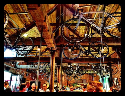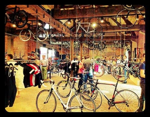 E’ stato inaugurato da poco un nuovo concept store dedicato alla bicicletta chiamato Velodome nel quartiere di Berchem di Anversa. E’ stato realizzato in una vecchia struttura in mattoni rossi  che ospitava la stalla di una storica birreria. Lo spazio è molto cool: soffitti altissimi al quale sono appesi a dei fili telai di biciclette di marche di altissima gamma, mattoni, ferro e legno gli elementi dominanti.
