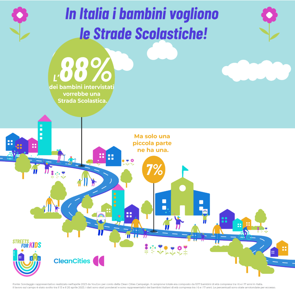 A maggio una mobilitazione europea ha fatto scendere centinaia di famiglie e di ragazzi in piazza per chiedere strade scolastiche sicure. E’ stata la terza mobilitazione europea “Streets for kids”, e ha smosso un mondo colorato di persone che sono scese in strada con girotondi, biciclettate e giochi. La Clean Cities Campaign (coalizione europea di oltre 70 ONG, associazioni ambientaliste, think-tank, movimenti di base e organizzazioni della società civile che ha come obiettivo una mobilità urbana a zero emissioni entro il 2030) ha commissionato un sondaggio “Strade scolastiche: cosa pensano i bambini in Italia”, per indagare come bambine e bambini si muovono, come lo vorrebbero fare, e la percezione che hanno dello spazio di fronte alle proprie scuole. Dal sondaggio emerge che l’88% dei bambini intervistati vorrebbe una strada scolastica, ma solo il 7% di loro ad oggi ne ha una. Il 47% è accompagnato a scuola in auto o in moto, ma il 50% vorrebbe camminare, andare in bicicletta o usare un monopattino. E tra le richieste: più verde, più ciclabili e meno auto nelle vicinanze delle scuole. Circa un terzo dei bambini e dei ragazzi vorrebbe più corsie e piste ciclabili per raggiungere la scuola, con punte vicine al 50% per chi frequenta le scuole medie e le superiori.