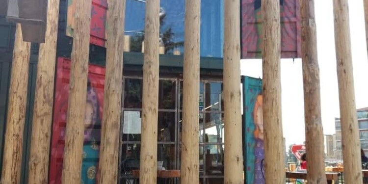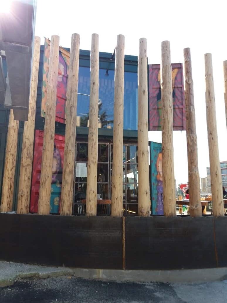 All’acciaio dei container è stato accostato, come materiale principale, il legno, utilizzato sia negli interni del chiosco che nel patio in richiamo all’ambiente arginale circostante. Unione di natura vera, con piante affisse tramite pannelli modulari alla parete del container, e disegno artistico dell’artista Tony Gallo che ha pensato ad un soggetto, in stile onirico, accovacciato in un rassicurante abbraccio con un albero.