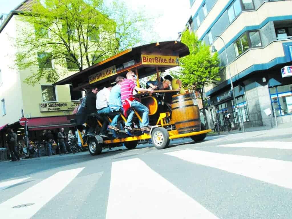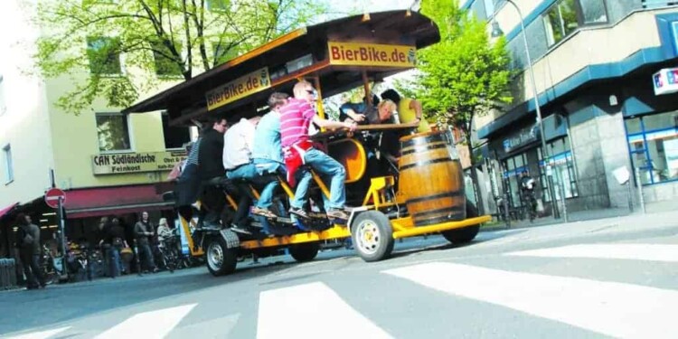 Le pensano proprio tutte! In molte città della Germania ma anche a Budapest e a Belgrado è scoppiata la moda del “Pub a pedali”. Tiene 12-15 ospiti, un guidatore e un fusto di birra. E’ un modo diverso e divertente per esplorare le città in compagnia divertendosi. Ovviamente l’importante è non alzare troppo il gomito altrimenti diventa pericoloso! Francoforte ha virato verso una scelta più “light” e salutare: l’Applerbike. Su questo pedalò, nel quale gli avventori chiacchierano e pedalano rifocillandosi al tempo stesso, viene servito sidro di mele. Il fusto tiene fino a 20 litri, e molti sono provvisti anche di porzioni di pizza per completare l’offerta. A Friburgo hanno lanciato un Wein-bike, il cin cin pedalando si fa con il Vino. Quest’ idea, partita in Olanda, è molto piaciuta e si sta diffondendo anche in Spagna. L’unico problema è legato alla misura: chi l’ha usata per esagerare ha creato un danno a tutti, perché in alcune città della Germania ne è stato vietato l’utilizzo a seguito di episodi estremi di ubriachezza. A Berlino viene spesso utilizzato per tour guidati. il Pub a pedali è un’idea carina ma a dire il vero lo spirito sano della bicicletta rischia facilmente di essere tradito. Per informazioni www.bierbike.de