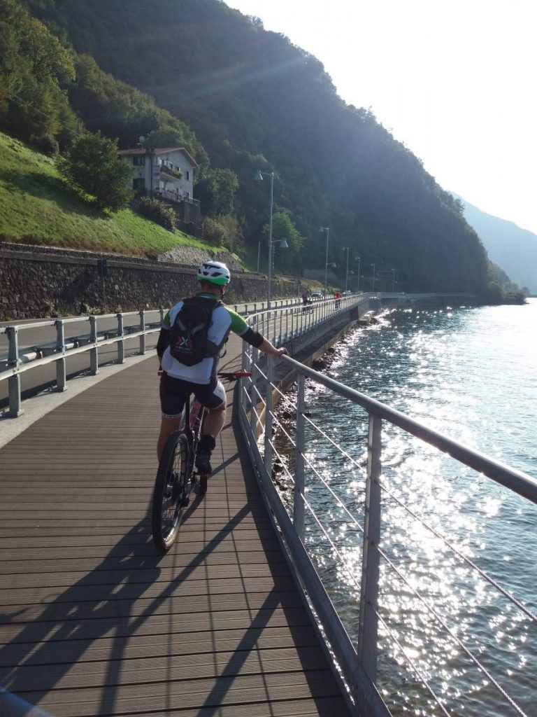 Il tracciato passa poi lungo la sponda orientale del lago d’Iseo. Prima tappa Pisogne dove si può fare una visita alla Chiesa di Santa Maria della Neve, dove è conservato un ciclo di affreschi del Romanino. Da qui la ciclabile prosegue per Toline – Vello di Marone (spettacolare e suggestiva la ciclopedonale che utilizza la vecchia strada costiera in disuso da anni) e Sulzano.