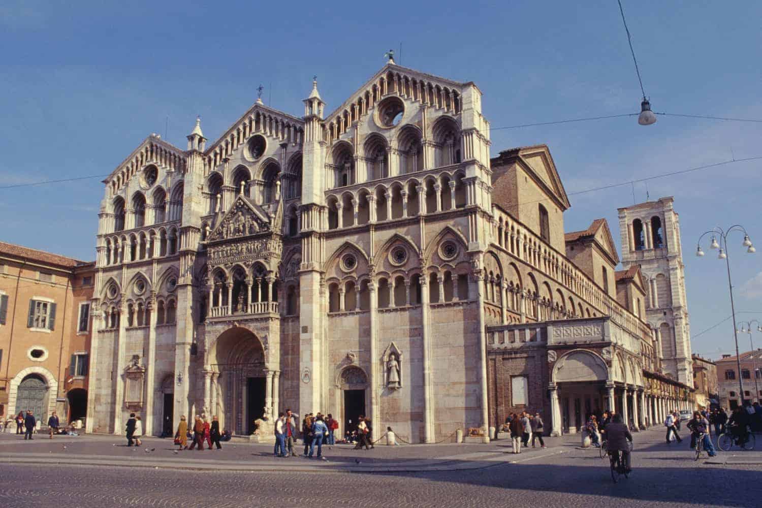 Ferrara sorge sulle sponde del Po di Volano, che separa la città medioevale dal primitivo borgo di San Giorgio e delimita il confine con i nuovi insediamenti contemporanei a sud delle mura. In bici si pedala nella storia, ammirando la Cattedrale gotico-romanica, costruita a partire dal XII sec., intrisa dei segni di tutte le epoche storiche attraversate dalla città, l’antica via delle Volte, probabilmente la via medievale più lunga in assoluto. Lo splendido monastero di S. Antonio in Polesine con il suo ciliegio giapponese e Palazzo Schifanoia, edificato nel 1385 da Alberto V d’Este su base quadrangolare, senza le ali laterali, pensato come un piccolo luogo di ristoro, in cui consumare pasti e dedicarsi all’ozio, con una facciata urbana ed una seconda facciata nel giardino: come equivalente della villa suburbana dell’antica Roma, precedette il modello rinascimentale che a Roma fu rappresentato dal Belvedere costruito da Niccolò V. Si prosegue verso Piazza Ariostea al Palazzo dei Diamanti passando da Parco Massari e dal Quadrivio degli Angeli fino a via Ercole I° d’Este, nella Ferrara del Bassani.