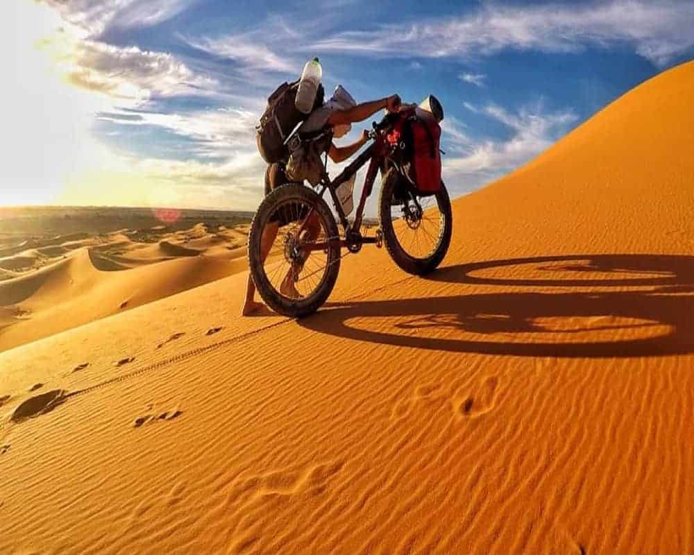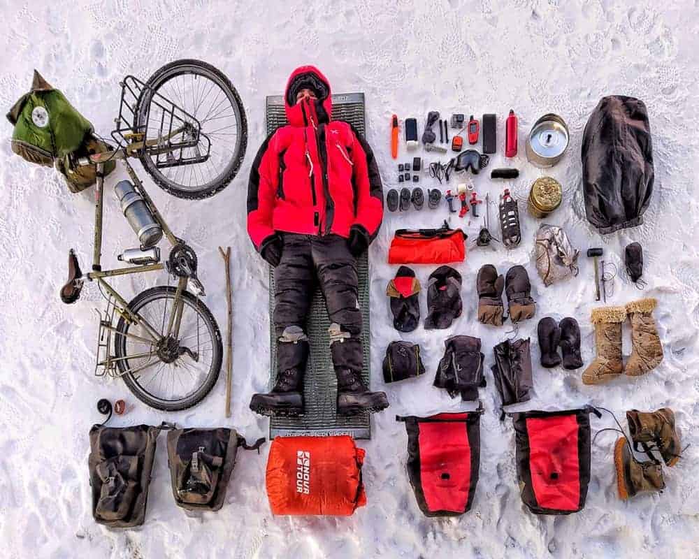 Ma prima di arrivare in Siberia ci sono una pedalata da casa fino all’Etna e anche da casa alle Cime di Lavaredo. Per non dire di quella fino ad Amsterdam, dove cambia la bici e prende la Surly che lo accompagna ancora. E poi ancora Danimarca, Islanda e Norvegia, Capo Nord. Per vivere e guadagnare un po’ fa il giocoliere per strada. Il cartello dice: “A push to reach a dream”, una spinta per raggiungere un sogno. Che prima del deserto bianco lo porta nel rovente Sahara, dove sceglie di pedalare in piena estate: 410 km con punte di + 48 gradi. “Seguivo la mappa dei pozzi, portando con me 24 litri d’acqua, bevendone 12 al giorno, con altrettanti di riserva nel caso il pozzo successivo fosse secco, o senza corda, o carrucola per calare il secchio. – racconta Lorenzo Barone – Temperature altissime, che ho ritrovato in Siberia ma col segno meno davanti”.