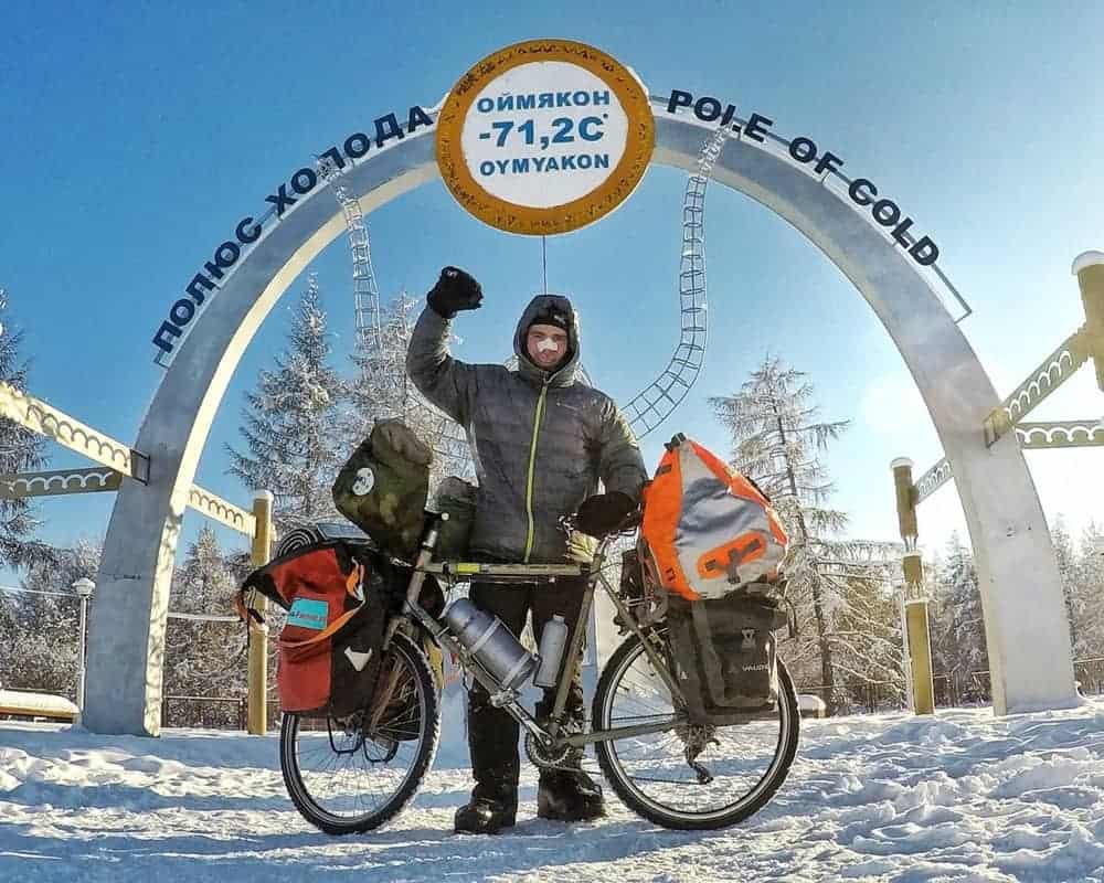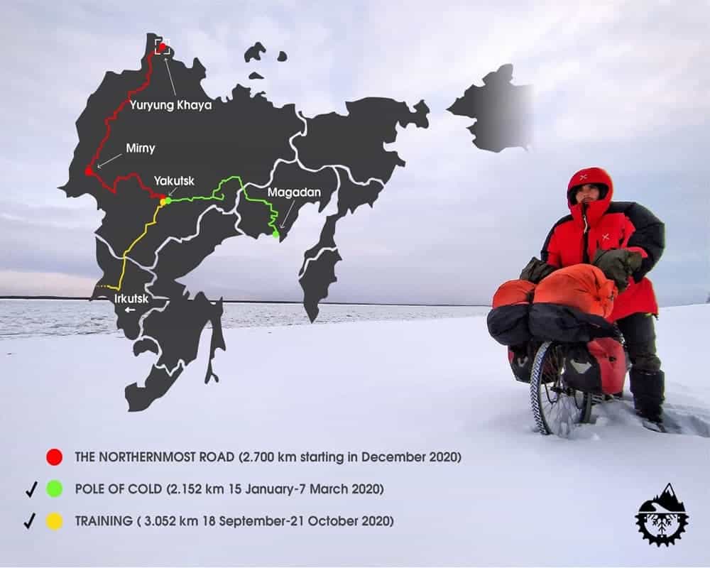 Vita che comincia, in sella, quando compie diciotto anni e si trova nella galleria dell’ex ferrovia Spoleto-Norcia, trasformata nel tempo in percorso ciclabile, ad asciugare i vestiti al fuoco. Dopo un acquazzone preso lungo il tragitto che lo porta all’ascesa del Monte Vettore, vetta più alta dei Monti Sibillini, con i suoi 2.476 metri di altitudine. Con l’aggiunta, poi, di un viaggio in bici da San Gemini, sua cittadina natale, 4.866 abitanti in provincia di Terni, in Umbria, verso il Portogallo. Con una normalissima city-bike che all’altezza di La Spezia l’abbandona. Ma lui non abbandona l’idea, torna indietro e prende un’altra bici, anche questa messa male, lasciata in garage per vent’anni. Tanto che le marce non vanno e allora per cambiare si ferma, sposta la catena con le mani e va, fino ad essere costretto a trasformare la bici in scatto fisso per poter proseguire. “A Siviglia poi ho incontrato un triatleta che mi ha aggiustato un po’ la bici, che però all’altezza di Barcellona si è rotta di nuovo e allora sono tornato a casa ancora a scatto fisso”. La voce narrante è quella di Lorenzo Barone, ciclo viaggiatore oggi 23enne, raggiunto via WhatsApp a Pokrovsk Sacha Yakutia, in Siberia, dove si trova già da un anno. E da dove racconta la sua avventura, dopo aver pedalato 52 giorni lungo la strada più fredda del mondo.