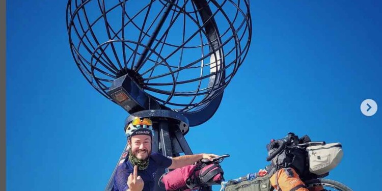 Infatti il 5 agosto 2022, Pietro Franzese, 27 anni appena compiuti, professione cicloturista YouTuber, in sella alla sua bici a scatto fisso, ha raggiunto Capo Nord (partendo da Milano) con l’intento di sensibilizzare sugli sprechi alimentari e raccogliere fondi per il Banco Alimentare. E la prima cosa pubblica che ha fatto (con relativo post ovviamente) è stato alzare la mano in segno di vittoria, con le due dita a formare la V sotto al famoso mappamondo. E fin qui, niente di strano.