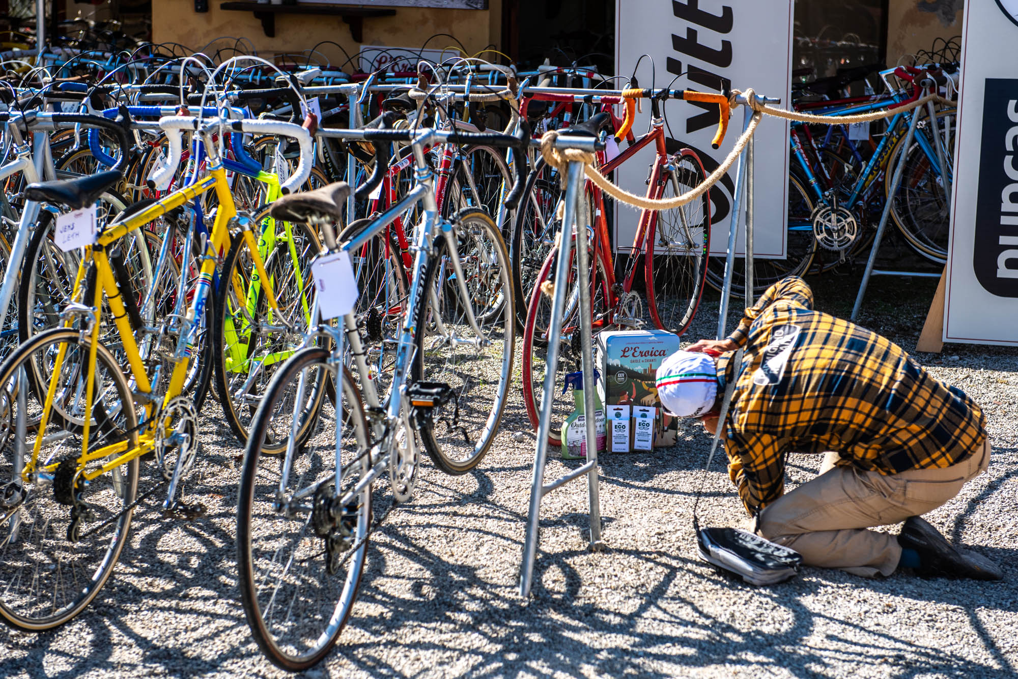 Si posizionano qua e là con le loro ciclo-officine per offrire assistenza meccanica, ma anche psicologica se occorre. Come Simone di Chianti Bicycles a Castelnuovo Berardenga, il cui punto di assistenza è diventato in breve anche una via di mezzo tra un set fotografico, un palco di stand up comedy e un gruppo di auto-aiuto dove abbiamo passato la maggior parte del sabato (non c’è bisogno di dire che io non facevo parte degli eroici veri del sabato, giusto?). La gente arrivava, stanca o carica, in avaria meccanica o psicologica, vestiti strani, abbinati o rabberciati, e riceveva assistenza e poi restava per una foto, uno scherzo, due chiacchiere. Il tandem di una coppia scandinava, la bici così vecchia che “dove lo trovo ‘sto pezzo? Tocca fare ‘n accrocchio …” quello che “non ce la faccio più” e si guadagna un attimo di tregua all’ombra, o quello con la maglietta dei pompieri celebrata da Simone ex vigile del fuoco con una veemenza di parte tutta toscana.