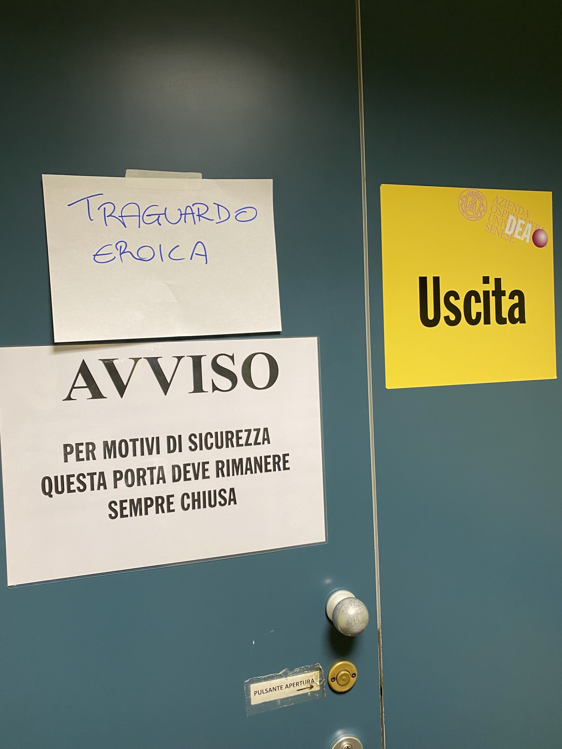 Anche medici, infermieri, autisti di ambulanze sono tra i protagonisti silenziosi di questo tipo di manifestazioni. Perché detto così sembra banale, eppure se non ti capita (o non lo vedi capitare) non ci pensi: ad ogni Eroica, sono tantissime le persone che cadono, e si “sbucciano”. Quasi sempre niente di grave per fortuna, però il reparto del Pronto Soccorso di Siena durante questo weekend è una bizzarra e surreale succursale di Gaiole. Ci si incontra, in tantissimi, ci si riconosce dal look, ognuno con una benda, un cerotto, un tutore, e ci si festeggia come vecchi amici ritrovati, si fanno persino le foto ricordo. E la gratitudine per queste persone che dedicano il loro tempo a rabberciare questi buffi ciclisti impolverati e incauti di ogni età e nazionalità, si mischia all’ammirazione perché riescono a farlo sempre con empatia e senso dell’umorismo e siccome quello non lo lasciano fuori nemmeno dall’ospedale, sulla porta di uscita del Pronto Soccorso qualcuno ha attaccato un cartello con scritto “TRAGUARDO EROICA”.