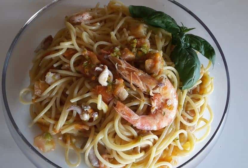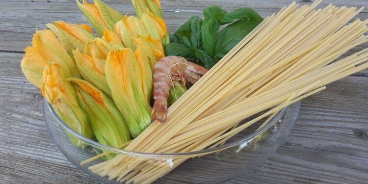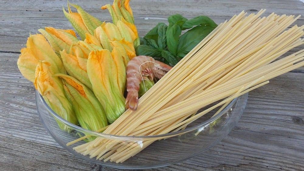 Numero due: lista della spesa. Ipotizziamo che siate in tre. Vi servono un bel pomodoro, 300 grammi di misto di pesce, una quindicina di fiori di zucchina, aglio, basilico e 250 grammi di pasta a piacere (i vermicelli sono collaudati). Più mezzo bicchiere del famoso pinot di cui sopra.