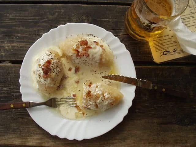 Rosolate nel lardo pancetta, aneto e cipolla tritata. Servite i cepelinai con questa salsa, panna acida e aneto.