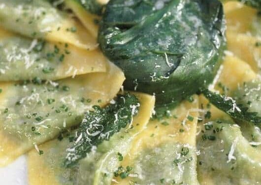 Fate fondere il burro in una padella. Scolate bene i ravioli e saltateli nella padella con il burro fuso e serviteli con il parmigiano grattugiato. Ornate con erba cipollina