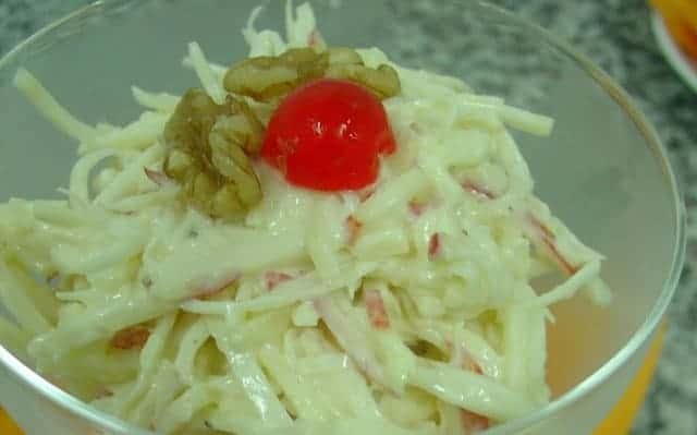 • Se necessario aggiustare l’insalata di sale e pepe, disporla in coppette di vetro, cospargerla di noci tritate e guarnirla con una fettina di mela.